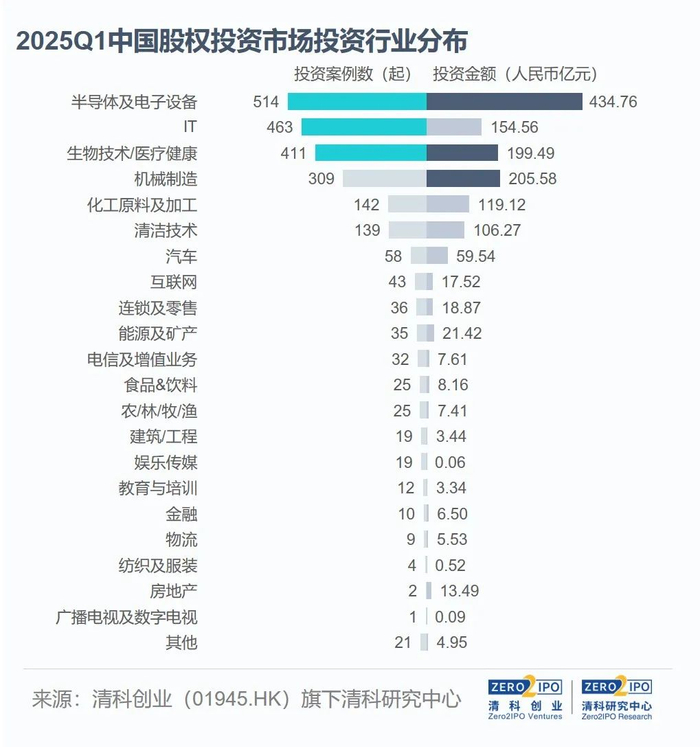 2025年第一季度,硬科技领域仍是机构的关注重点。半导体及电子设备行业投资案例数和金额均位列首位,本季度共完成514起投资案例,同比上升12.5%;投资金额434.76亿元,同比上升37.0%,其中的大额案例包括北电集成、皖芯集成、京隆科技等。IT行业获投热度次之,本季度共完成463起投资,同比上升9.5%;披露投资金额154.56亿元人民币,同比下降53.0%。生物技术/医疗健康行业案例数和金额均位列第三位,共完成411起投资案例,同比增长6.5%;披露投资金额199.49亿元人民币,同比下降28.4%,本季度完成的大额案例包括天士力、瑞桥鼎科、帕母医疗等。