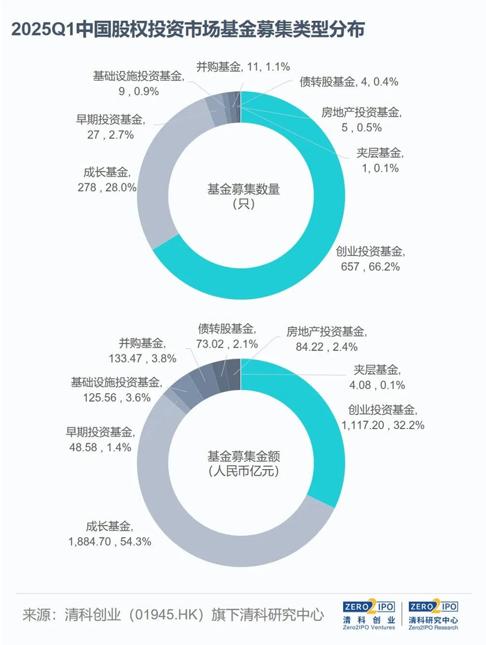 2025年第一季度,我国股权投资市场新募集创业投资基金数量领先,共有657只,同比微降3.1%,数量占比维持在65%以上,与2024年同期基本持平;募资规模为1,117.20亿元人民币,同比增加2.6%,占比32.2%,同比增加1.7个百分点。成长基金数量次之,募资规模居于首位。本季度共278只成长基金完成新一轮募集,同比增加3.0%,占比28.0%(同比+1.6pct);募资规模1,884.70亿元人民币,同比增加42.4%,占比54.3%(+17.3pct)。