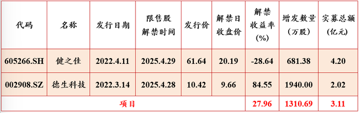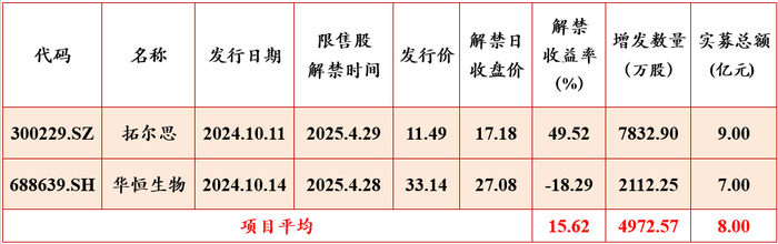 本周共有4家上市公司的定向增发项目到期解禁。其中2家公司的定向增发项目按竞价发行,竞价项目解禁平均收益率为15.62%;2家公司的定向增发项目按定价发行,定价项目解禁平均收益率为27.96%。
