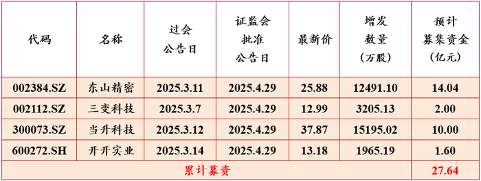 2025年4月28日至2025年5月4日期间(本周),共有7家上市公司的定向增发项目获得证监会核准通过,其中3家公司的定向增发项目按竞价发行,4家公司的定向增发项目按定价发行。