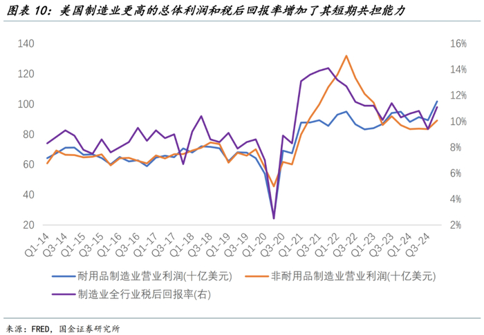 美国企业的提前补库以应对居民消费的前置也增加了其短期内“共担关税”的能力。小幅增加的库存与明确走弱的需求,叠加更高的总体利润和回报率,企业涨价的能力和意愿都相对有限。