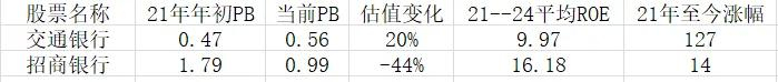 其二就是能把企业盈利转化为投资所得。公司的辛苦经营是客观的、肉眼可见,但能否转化成股价上涨,中间却有巨大鸿沟。有句话很流行叫“用高成长消化高估值”,这应该也是很多成长赛道选手的信仰。但问题是如果高成长都用来填高估值,那股价怎么涨?你还赚什么钱?我们来看下2021—2024年交通银行和招商银行的案例: