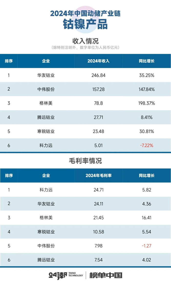 在8个保持正增长的细分领域中,只有4个实现10%以上增长,依次为,钴镍(营业收入同比增长67.80%)、铜箔(增长26.09%)、储能电池及系统(增长13.83%)、锂电池结构件(增长13.80%)。