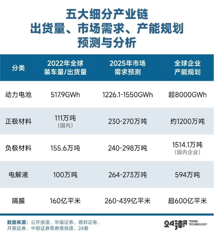 另据24潮产业研究院(TTIR)此前统计数据显示:截止目前,在动力电池、储能电池、正极材料、负极材料、电解液与锂电隔膜这6大核心赛道上,已知的企业产能规划均远超2025年第三方研究机构对市场需求的预测上限,未来三年内产业大洗牌已经不可避免。