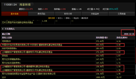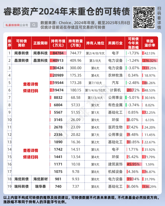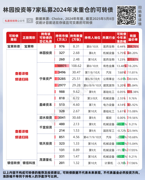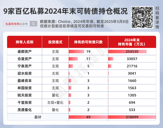 除睿郡资产、合晟资产外,宁泉资产、迎水投资、盈峰资本、林园投资、锐天投资、千宜投资、茂源量化等7家百亿私募,在2024年末也持有一些可转债。