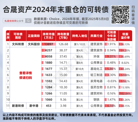 合晟资产的第一大重仓可转债是文科股份的“文科转债”,旗下2只产品分别是该可转债的第1、10大持有人,合计持有市值约为1.39亿元。(点此查看完整名单)