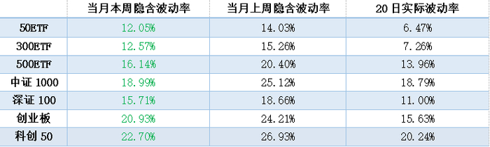 当月本周、上周隐含波动率与20日实际波动率对比如下: