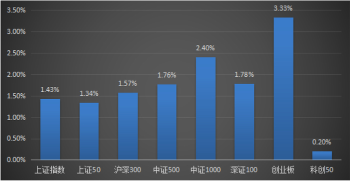 上周市场震荡上行,截至上周五收盘,上证指数上涨1.43%。叠加节后效应,各品种隐含波动率全面回落。20天实际波动率方面,各品种实际波动率全面大幅下行。其他指数涨跌幅度如下图: