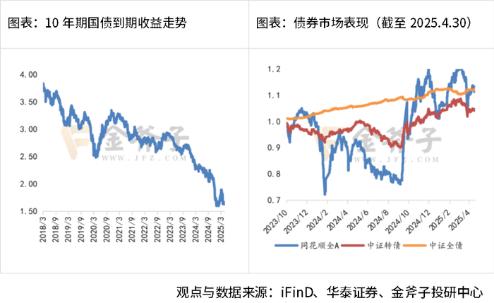 4月债市表现强势,中证全债上涨1.41%,月内受权益市场走弱,股债跷跷板效应下债市交易经济走弱与利好政策出台预期。月底政治局会议增量政策有限,政策预期略有落空,债市横盘。展望后市,降准降息政策在国新办会议后落地,流动性宽松持续。但短期内随中美博弈逐渐出现转机,债券或面临一定压力。长期上看,基于宏观修复节奏仍偏缓与资产均衡配置角度,债券配置逻辑仍强。