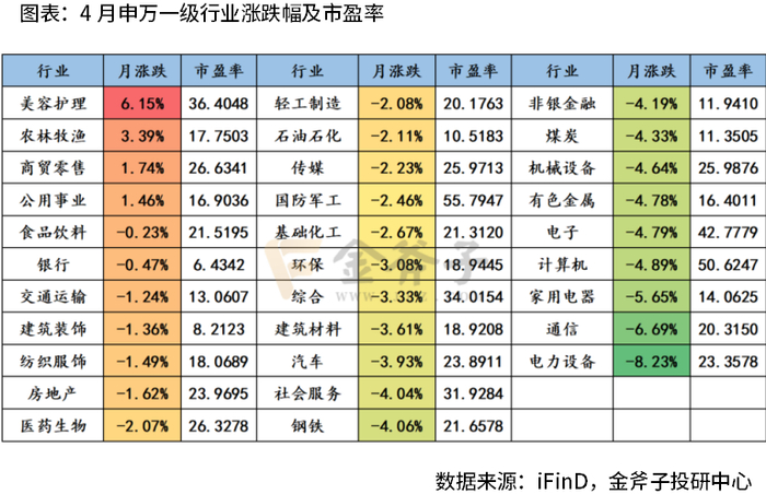 市场风格轮动,消费板块独占鳌头:截至4月30日,A股申万一级行业跌多涨少,31个板块中仅美容护理、农林牧渔、商贸零售与公用事业实现上涨,而电力设备、通信、家用电器与计算机跌幅较大。由于外部风险因素冲击,外需逐渐收紧,家电与计算机、电子等由于业绩压力与出口冲击下行明显。而内需板块重要性再度上涨,相关稳增长政策不断落地背景下,美容护理与商贸零售等板块实现上涨。展望后市,市场风险偏好正在边际修复中,行业景气度演绎预计围绕关税超跌修复领域展开。