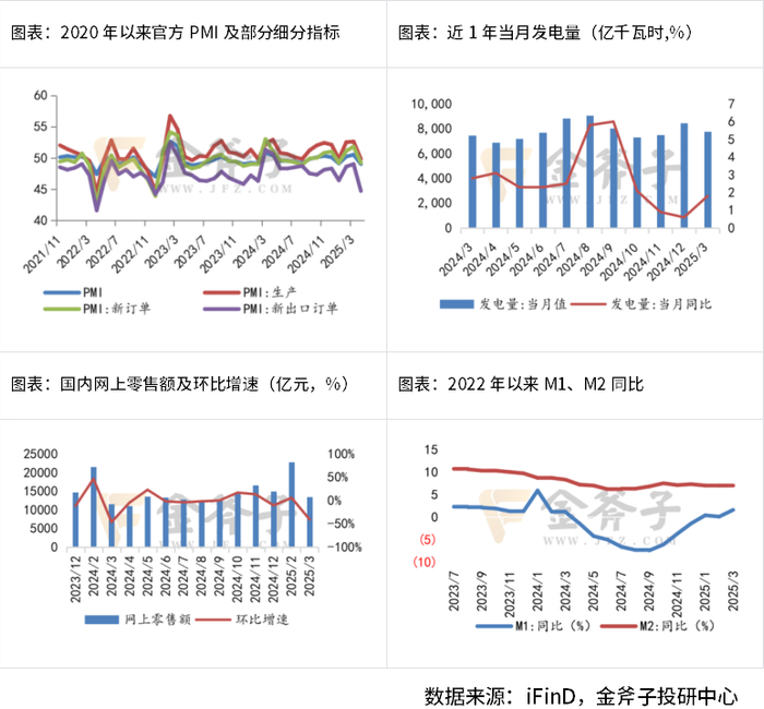 经济基本面边际转弱,宏观修复较缓:4月制造业PMI较前值下降1.5个百分点,不及市场预期且跌落荣枯线之下,进入收缩区间。分项上看产需两端均走弱,其中新出口订单下行幅度较大,背后或受对等关税政策影响。服务业与建筑业景气度则表现稳健,继续维持在扩张区间,主要依托于清明假期对消费拉动以及进入施工旺季影响。发电量层面,2025年3月共发电7780千瓦时,同比上涨1.80%。电子商务层面,2025年3月网上销售额为13479.6亿元,同比上涨16.74%。金融数据层面3月份M1和M2同比录得1.60%和7.0%,M1与M2剪刀差有所收窄,其中M1受政府债投放积极影响回升明显。