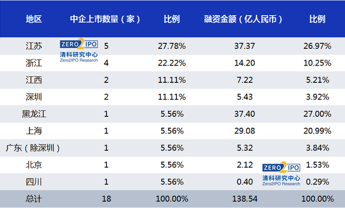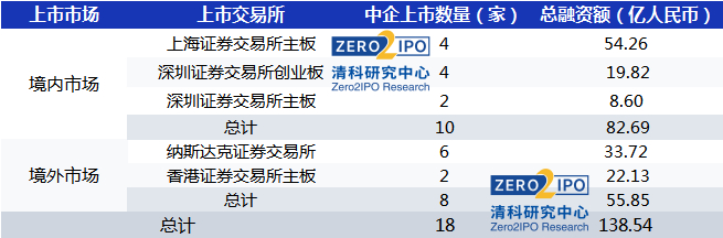 · 境内外上市中企共18家,总融资额为138.54亿人民币
