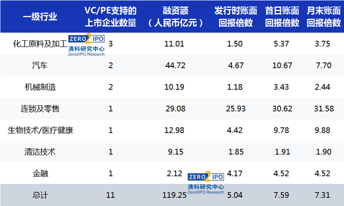 行业方面,4月获VC/PE支持的上市中企融资额排名前三的行业为汽车、连锁及零售、生物技术/医疗健康行业,融资额分别为44.72亿人民币、29.08亿人民币和12.98亿人民币。其中,连锁及零售行业的发行时账面回报为25.93倍,高于市场平均水平。