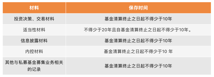 中基协《私募投资基金管理人内部控制指引》第二十六条规定:“私募基金管理人应当保存私募基金内部控制活动等方面的信息及相关资料,确保信息的完整、连续、准确和可追溯,保存期限自私募基金清算终止之日起不得少于10年。”