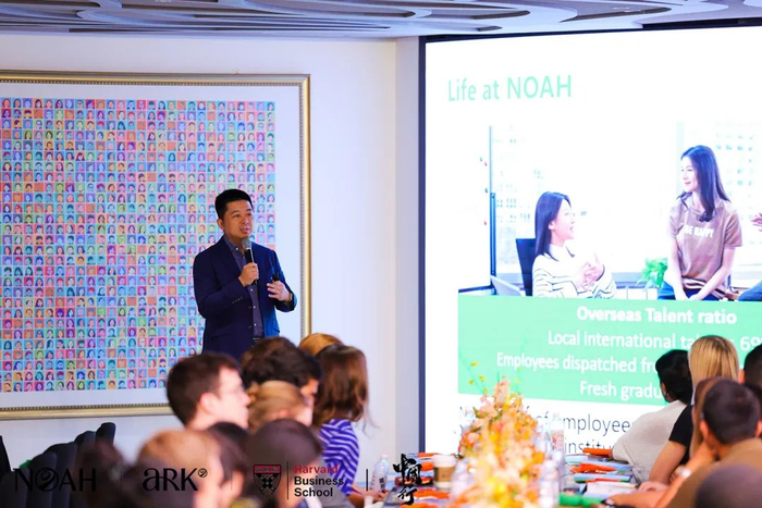 今日,诺亚ARK DeepNOAH全球人才发展品牌活动「全球智慧港湾,方舟共启新航」(A WARM WELCOME TO HARVARD)在诺亚财富N+广场热烈进行。诺亚控股CFO、ARK香港CEO潘青先生出席活动并发表演讲,为哈佛商学院(Harvard Business School)130余位来自全球各国的同学们,打开了一扇理解中国财富管理体系的智慧之窗。哈佛校友、Olive AM 国际私募一级基金部总经理尹颢先生,也通过视频为学弟学妹们送上温暖的问候与祝福。