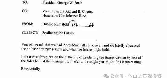 2001年4月12日,时任美国国防部长的唐纳德·拉姆斯菲尔德给当时的总统布什,副总统切尼以及国务卿赖斯发了一封邮件。标题是:预测未来。