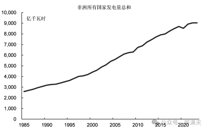 2023年,非洲所有国家的发电量总和是9029亿千瓦时,比2000年的4402亿千瓦时增长了105%。