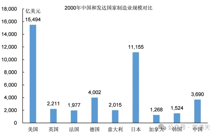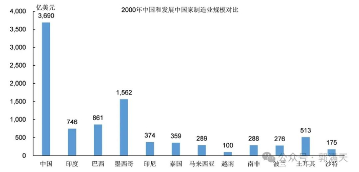 2000年,中国制造业的规模已经高于主要发展中国家,但是只比大部分发展中国家多了一两千亿美元,还没有数量级上的差距。