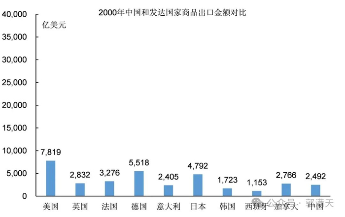 2000年中国的经济实力还十分孱弱,商品出口金额还远远无法跟发达国家对比。