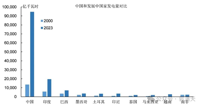 从2000年到2023年,中国的发电量增加了8.1万亿千瓦时,增长的绝对值远远超过所有发展中国家。