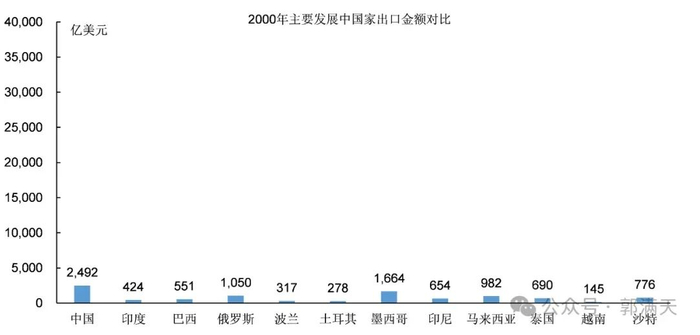 2000年中国的商品出口金额是2492亿美元,高于印度、巴西、墨西哥、印尼、马来西亚等其他发展中国家。