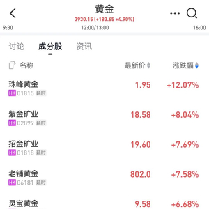 COMEX黄金昨夜盘中爆拉,截止收盘涨1.83%,收复3300点,收盘3301.4点。今天A股,港股黄金板块涨幅居前,截至发稿前港股黄金板块涨4.90%,A股黄金概念板块涨2.06%