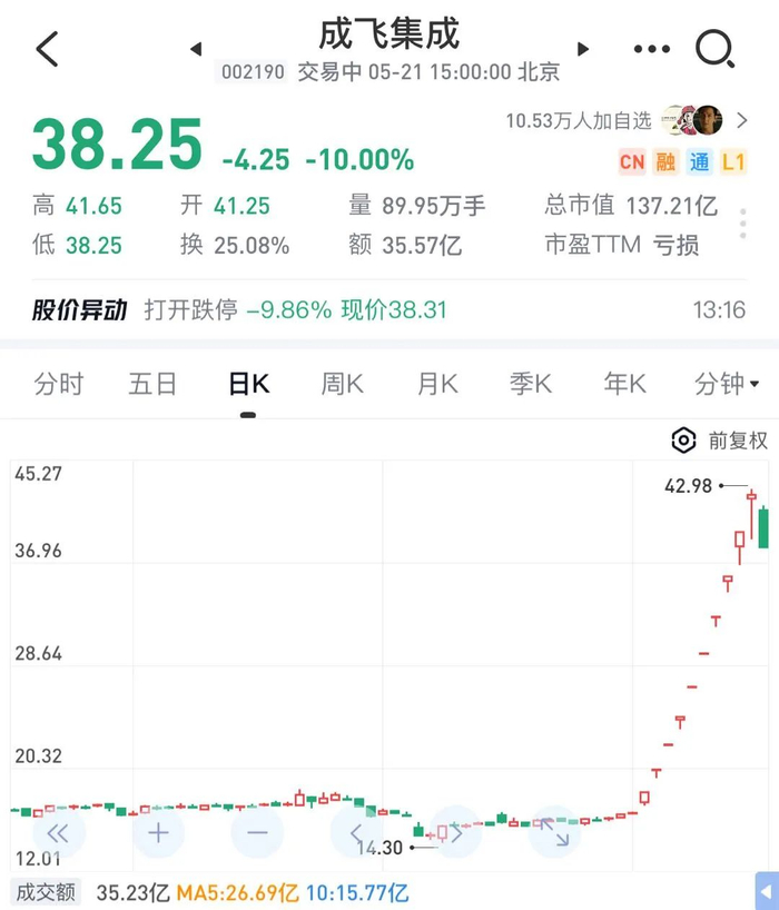 成飞集成从5月7号开始到今天,无疑是5月的一个“龙头”了,连续9个涨停板,股价上涨了超150%。面对不断攀升的股价,公司发布公告称,目前公司股票波动严重异常,存在市场情绪过热的情形,可能存在非理性炒作,交易风险大,存在短期大幅下跌的风险。