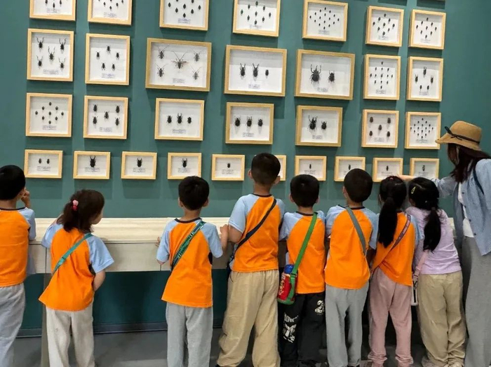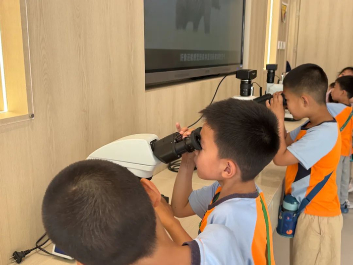 孩子们走进昆虫标本厅,目光立刻被五彩斑斓的蝴蝶和形态各异的甲虫标本吸引,通过5000倍显微镜,看到了蝴蝶翅膀上细腻的鳞片结构,每一片鳞片都像是精心雕琢的艺术品。