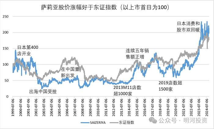 日本的意式餐厅萨莉亚(7581JP)是受关注比较多的一支餐饮股,它的股价在2003年4月至2024年7月之间刚好达成了十倍股成就,虽然和美国的墨式烧烤以及日本的泉盛控股相比涨幅不算特别高,但因为极高的就餐性价比而被广为喜爱。