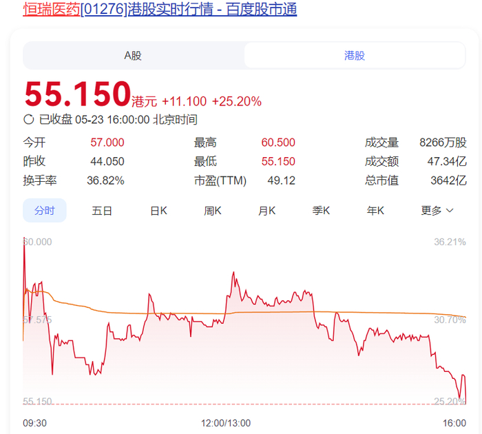 香港上市首日,恒瑞医药高开29.4%,截至收盘,涨25.2%,总市值3642亿港元。