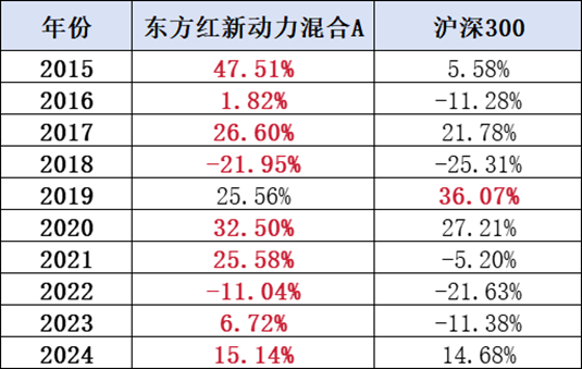 东方红新动力混合基金成立于2014.01.28,根据基金历年年报,东方红新动力混合基金A份额2015年-2024年净值增长率分别为47.51%、1.82%、26.60%、-21.95%、25.56%、32.50%、25.58%、-11.04%、6.72%、15.14%,业绩比较基准收益率分别为6.97%、-8.07%、13.42%、-16.59%、24.99%、18.98%、-2.67%、-15.27%、-7.47%、12.36%。业绩比较基准为:沪深300指数收益率*70%+中国债券总指数收益率*30%。基金经理:杨达治(2014.01.28-2015.12.08),孙伟(2016.01.22-2017.04.11),周云(2015.09.14-至今)。
