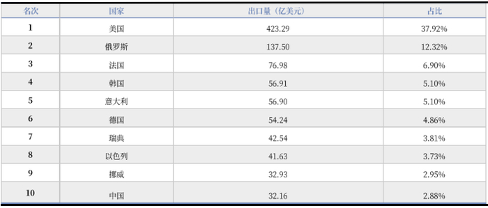 根据俄罗斯国际武器贸易分析中心(GAWAT)的数据,在2024年世界军贸排名中,中国位列第10位,出口额为32.16亿美元,全球市场占比仅为2.88%,仅为排名第二得俄罗斯的25%左右,以及排名第一美国份额的十分之一,这与中国军工的实力差距明显,未来提升空间巨大。