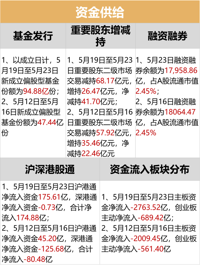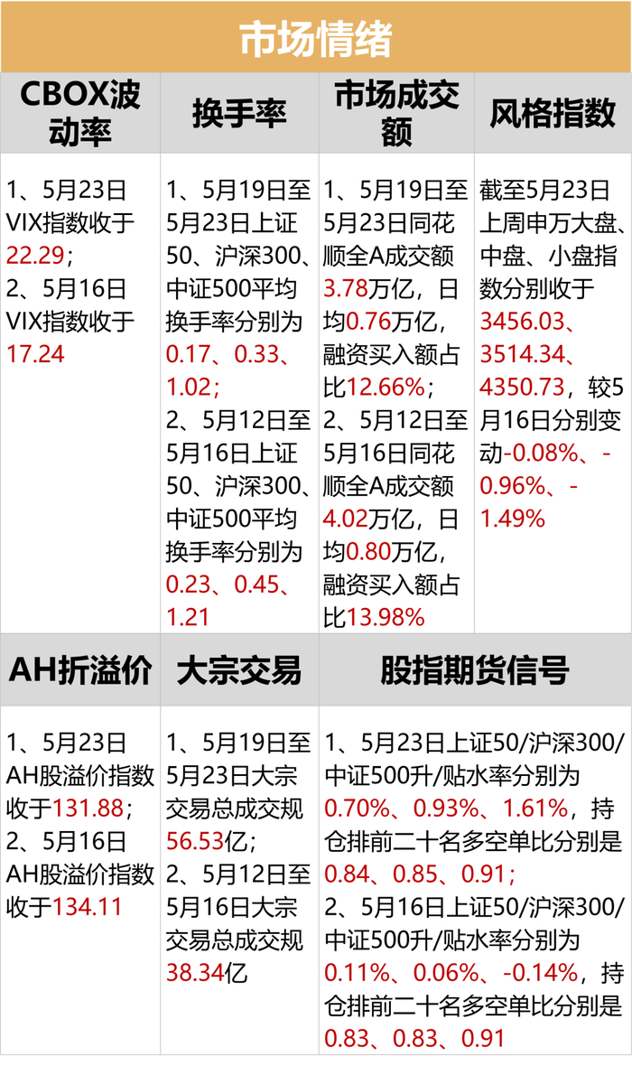 货币方面,本周(5/19-5/23)央行货币净投放央行货币净投放4600亿元,逆回购到期(7天)为4860亿元;5月12日至5月16日央行货币净投放-3501亿元,逆回购到期(7天)为8361亿元。