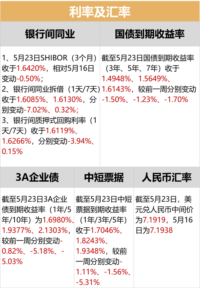 利率方面,本周(5/19-5/23)银行间同业利率整体呈现下行态势;国债收益率整体呈下行态势,企业债收益率呈下行态势。