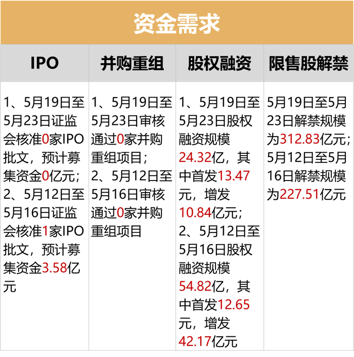 资金方面,本周证监会核准0家IPO批文,较上周减少1家,预计募集资金较上周减少3.58亿元。本周解禁规模为312.83亿元;5月12日至5月16日解禁规模为227.51亿元,本周解禁压力较重。本周新成立偏股型基金份额为94.88亿份;5月12日至5月16日新成立偏股型基金份额为47.44亿份,与上周相比新成立基金数量呈增加趋势。