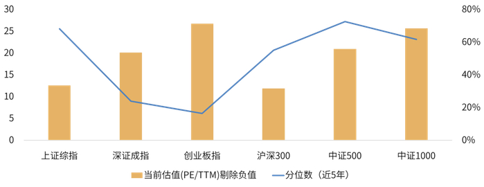目前上证综指PE(TTM,剔除负值)下行至12.57倍,历史分位数下行至68.13%。深证成指PE(TTM,剔除负值)下行至20.1倍,历史分位数下行至24.00%。创业板指PE(TTM,剔除负值)上行至26.72倍,历史分位上行至16.53%。
