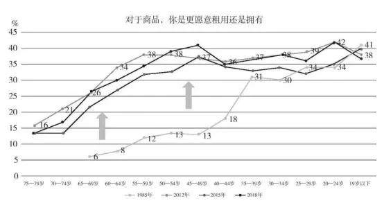 日本NHK在1985到2018年,多次做过“对于商品,你是更愿意租用还是拥有”的问卷调查,结果显示,从1985年到2012年,当时40岁以上的人,发生了巨大的变化,反映的是“失去的20年”对消费力的影响。