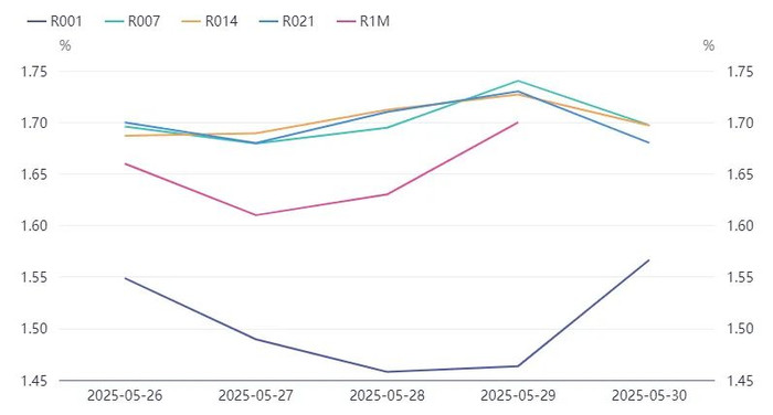 上周(5.26~5.30),银行间市场短期回购利率整体呈现“隔夜波动、长端趋稳”特征,反映市场流动性在跨月扰动下仍保持合理充裕。隔夜利率(R001)呈现先抑后扬走势,从5月26日的1.5489%降至28日的1.4579%,随后受跨月资金需求推动回升至30日的1.5667%,全周波动幅度约0.11个百分点。这一波动与税期走款结束后银行融出意愿回升相关,全周银行体系日均融出规模达3.56万亿元,较前一周增长17.9%。7天利率(R007)表现最为稳定,中枢维持在1.69%附近,最高触及5月29日的1.7402%,最终收于30日的1.6972%,与央行通过逆回购和MLF累计净投放1.03万亿元流动性形成支撑密切相关。值得注意的是,3个月和6个月买断式逆回购操作规模达7000亿元,有效优化了市场流动性结构。中长期利率(R014、R021)波动幅度更小,14天期利率在1.6871%~1.7270%区间震荡,21天期利率稳定在1.68%~1.73%,反映市场对跨月后资金面预期较为平稳。不过,1个月期利率(R1M)数据在5月30日缺失,可能与月末数据统计时点调整有关。