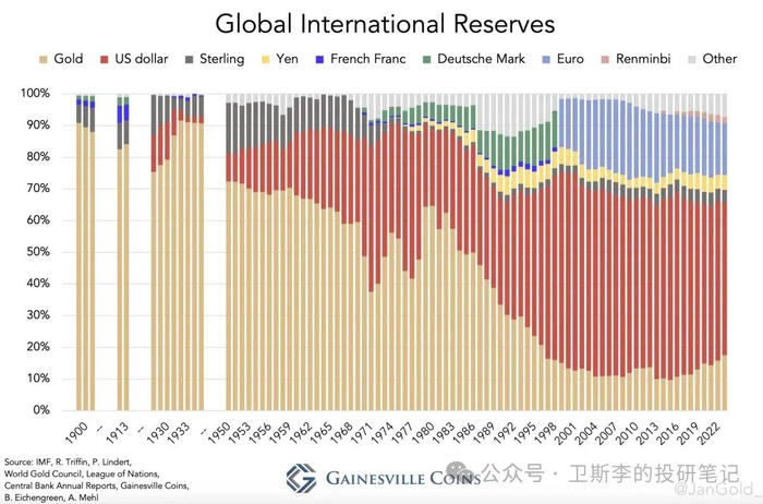 因此,投资者转而涌向黄金。在1930年代,黄金在外汇储备中的比重上升了约20个百分点,达到97%;在1970年代,则几乎翻了一番,达到60%。
