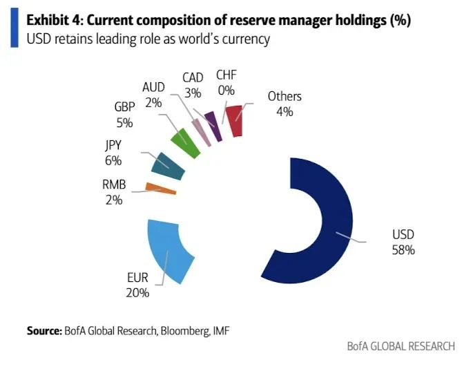 近年来,美元在全球外汇储备中的份额正在下降,目前58%的水平是自1994年以来的最低点。与此同时,各国央行正以前所未有的速度积累黄金——几乎达到了布雷顿森林时代的水平(指总量)。黄金在全球外汇储备中的占比已达约20%,甚至超过了欧元。
