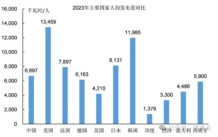 中国不仅在发电总量上达到全球第一,而且在人均发电量上也超过了德国、英国、意大利等发达国家。