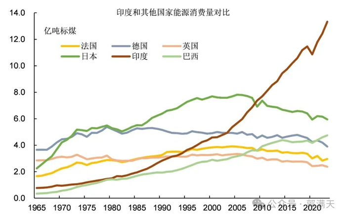 2023年印度的能源消费总量是13.33亿吨标煤,比英法德意四个欧洲国家的能源消费总和(11.26亿吨)还要高。
