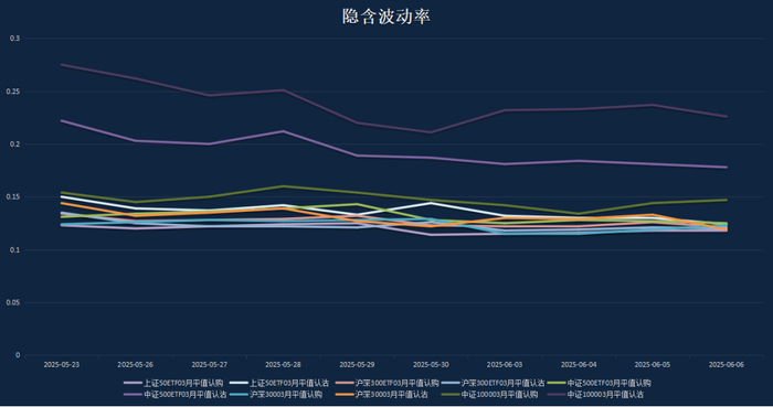 上周共4个交易日,A股主要指数普遍上涨。上证指数、深证成指和创业板指全周分别累计上涨1.1%、1.4%和2.3%。金融期权加权隐含波动率普遍下降。当前所有金融期权加权隐含波动率均降至历史40%分位以下。50ETF和300ETF期权加权隐波相对较低,处于历史5%分位以下;创业板ETF期权加权隐波相对较高,处于历史35%分位。科创50ETF期权加权隐波已降至历史20%分位以下,创去年9月24日以来新低。50ETF期权和创业板ETF期权市场情绪转向乐观,科创50ETF期权市场情绪更加乐观,500ETF期权期权市场谨慎情绪有所减弱。整体市场情绪向偏乐观转变。