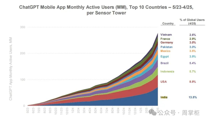 AI的全球扩散速度极快,Chat GPT在第三年就有90%的用户来自北美以外地区,而互联网用了23年才实现这一比例。印度是Chat GPT移动端最大的市场(占比13.5%),凸显新兴市场的快速采用。