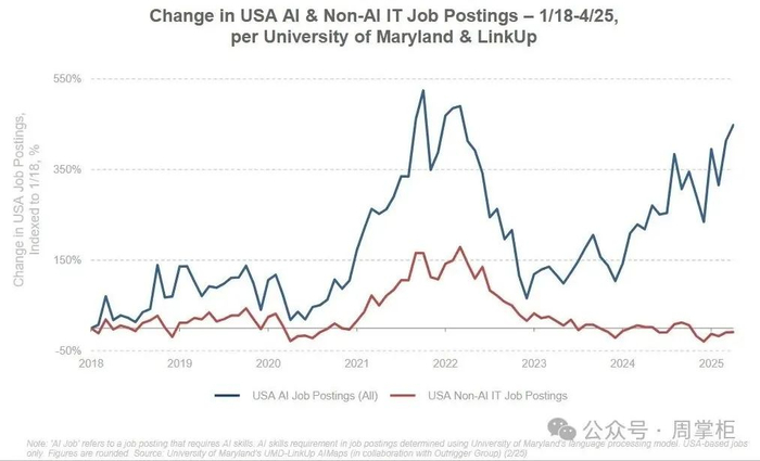 图表展示了美国AI和非AI IT职位招聘的变化,从2018年1月到2025年4月。AI职位(蓝色线)从0%开始,经历显著增长,2021年达到约350%,2023年再创新高近550%,最终在2025年4月增长448%。相比之下,非AI IT职位(红色线)基本保持稳定,略有下降,最终在2025年4月下降9%,波动在-10%至-20%之间。这反映了AI相关职位需求的快速扩张,而传统IT职位需求相对停滞。