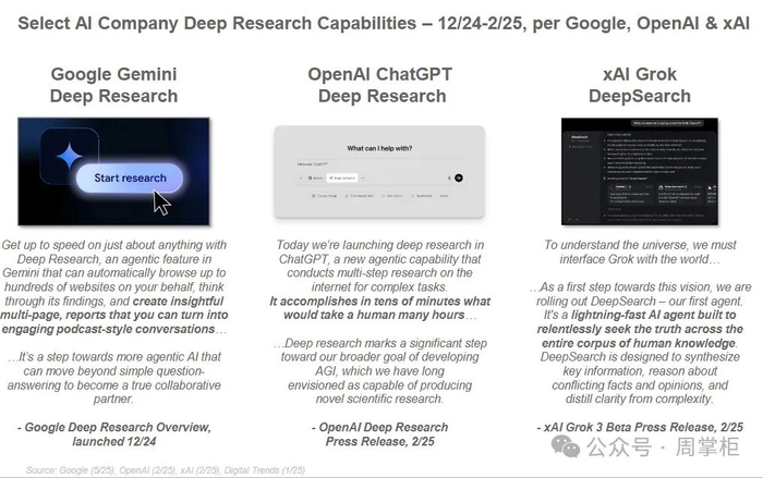 2024 年末至 2025 年初,Google Gemini、OpenAI ChatGPT、xAI Grok 同步布局 AI 深度研究能力,均依托智能体技术实现 “自主规划研究步骤、抓取分析信息、整合冲突观点并生成专业结论” 的全流程自动化,将人类数小时工作压缩至数分钟;技术路线各有侧重,Google 强调具身化协作属性,OpenAI 绑定 AGI 科研愿景,xAI 聚焦知识真理提炼,标志 AI 从被动问答迈入主动知识创造阶段,既颠覆知识密集型行业效率与人机协作模式,也推动巨头竞争从模型参数转向深度知识处理能力,加速知识生产智能化革命。