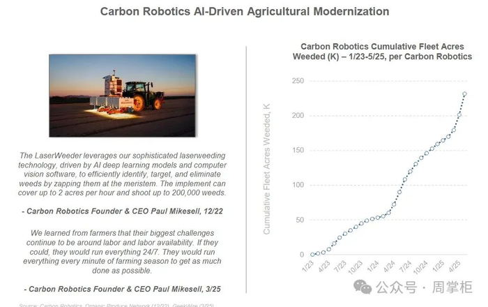 这张图表展现 Carbon Robotics 的 AI 激光除草技术(LaserWeeder)在 2023 年 1 月至 2025 年 5 月的落地成效:累计除草超23 万英亩,减少 10 万加仑草甘膦使用。技术上,其通过 AI 深度学习与计算机视觉精准识别杂草,以激光灼烧替代化学农药,单设备每小时覆盖 2 英亩、灭杀 20 万株杂草;该方案直击农业 “劳动力短缺(农民渴望全天候作业)” 与 “农药污染” 痛点,实现效率与可持续性双升级。从增长曲线看,前期试点后进入指数增长阶段,印证 AI 驱动的精准自动化方案因匹配农业规模化需求,形成 “技术验证→规模部署→数据反哺” 闭环,成为农业现代化的典型实践。