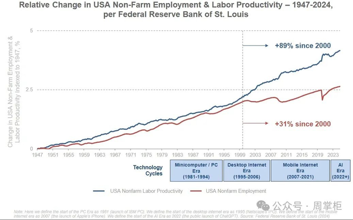这张图表展示了1947年至2024年间美国非农劳动生产率和就业的变化,数据来源于圣路易斯联邦储备银行,显示劳动生产率从基线0%增长至约2.8%,自2000年以来增长了89%,而非农就业从0%增长至约2.5%,自2000年以来增长了31%,反映了技术进步与就业增长并存的长期趋势;五个科技周期——Technology Cycles(1947-1981)、Minicomputer/PC Era(1981-1994)、Desktop Internet Era(1995-2006)、Mobile Internet Era(2007-2021)和AI Era(2022-)——显著推动了生产率提升,尤其AI时代自2022年起加速增长,凸显AI对效率的深远影响;报告(如第336页)定义AI时代始于2022年ChatGPT公开发布,外部数据(如斯坦福HAI和X用户@AI_Insights)进一步支持AI工具提升生产率55%的趋势;未来到2030年,AI可能继续推动生产率(如写作、编码任务),但人类角色或转向监督和训练AI系统(如RLHF),需适应新技能以应对就业结构变化。