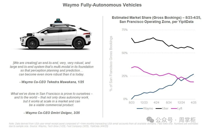 这张图表聚焦物理世界人工智能(Physical World AI)领域的Waymo全自动驾驶汽车,呈现2023年8月 - 2025年4月约20个月内,其在旧金山网约车运营区域的市场份额(基于毛订单估算)变化。Waymo从初始0% 起步,凭借自动驾驶技术持续拓展,逐步增长至约27% ,验证了其自动驾驶系统在实际市场中规模化应用的可行性,展现出物理世界AI场景下,全自动驾驶汽车商业落地的推进成果,数据源于YipitData,结合Waymo联合首席执行官对多模态、高鲁棒性系统的阐述,凸显技术支撑下商业拓展的逻辑 。