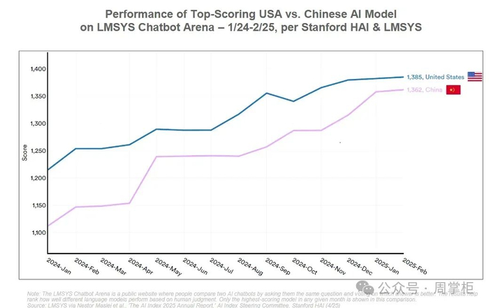 这张图表展示了2024年1月至2025年2月美国和中国顶级大语言模型(LLM)在LMSYS Chatbot Arena上的性能对比,数据由斯坦福HAI和LMSYS提供,美国模型得分从约1150稳步上升至1385,中国模型则从1100加速增长至1362,差距从初始50分缩小至23分,凸显中国AI模型在过去一年中的显著进步,正逐步迎头赶上美国模型的性能水平。